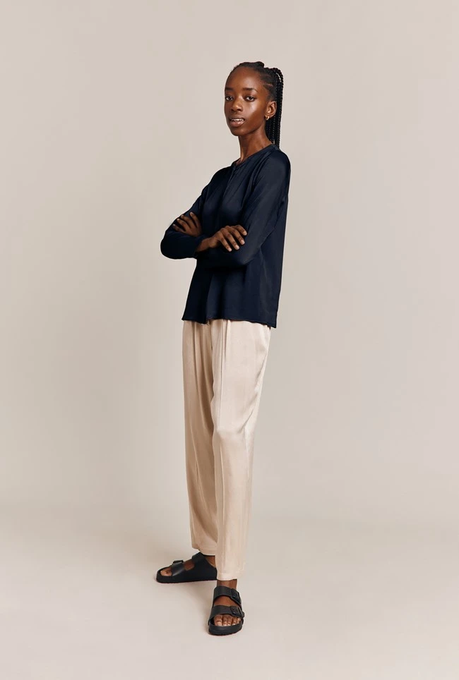 Say hello to your new go-to blouse – Efie. In a range of beautiful colours and crafted from our signature satin, Efie features simple straight sleeves, a round neckline to frame the face and front button detail. Pair with out Ella Trousers for the complete look.