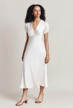 Jennifer is an elegant and sophisticated addition to your wardrobe. This stunning midi-length dress features angel sleeves that add a touch of feminine charm, while the v-neckline creates a flattering and alluring silhouette. The dress is crafted from luxurious satin, giving it a sleek and silky finish that glides effortlessly over the body. Dress up with heels and statement jewellery for a glamorous look or keep it understated with simple accessories for a more relaxed vibe.