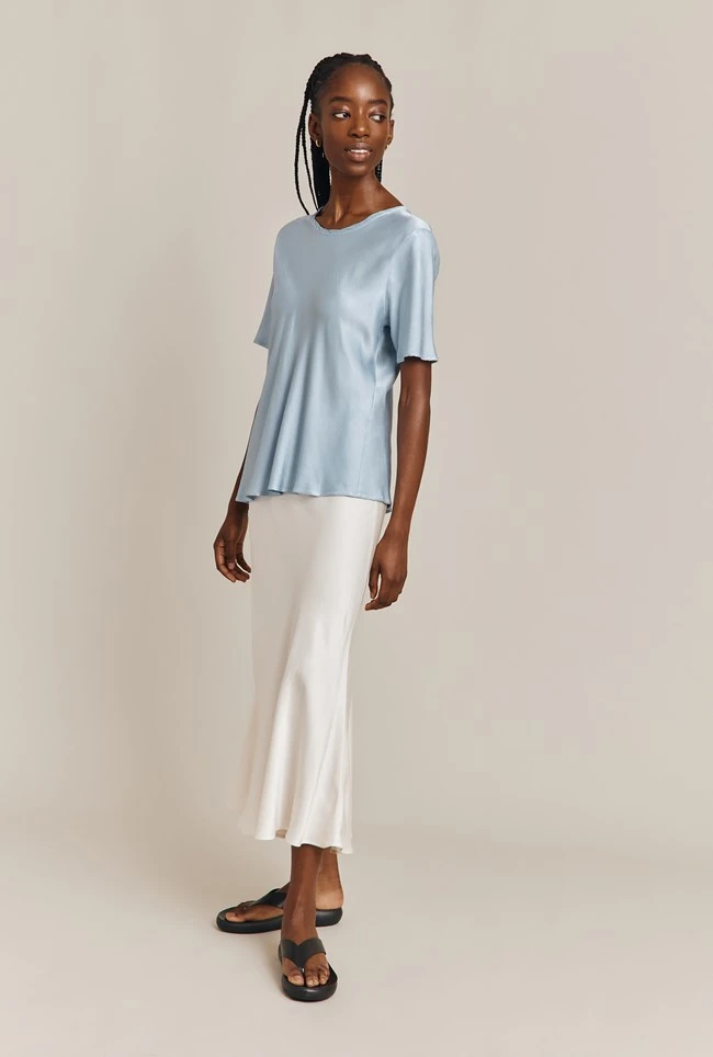 If you only have one skirt in your wardrobe, make it Luna. A true classic, this simple skirt is cut on the bias in a midi length and crafted in garment-dyed satin so it falls fluidly over the body to create a flattering, form-fitting silhouette. A subtly elasticated waistband ensures comfort. Dress up with a satin camisole and heels, or down with a simple tee, denim jacket and trainers – versatility is Luna’s superpower.