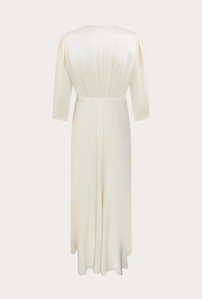 If you need a simple yet striking showstopper outfit, look no further than our Madison dress. Cut from sustainable EcoVero heavy satin, this vintage-inspired style features puffed shoulders, fabric covered buttons and three-quarter length sleeves. With a classic silhouette and front split detail, this ultra-feminine dress will endure season after season – plus it would also make the perfect bridesmaid’s dress.