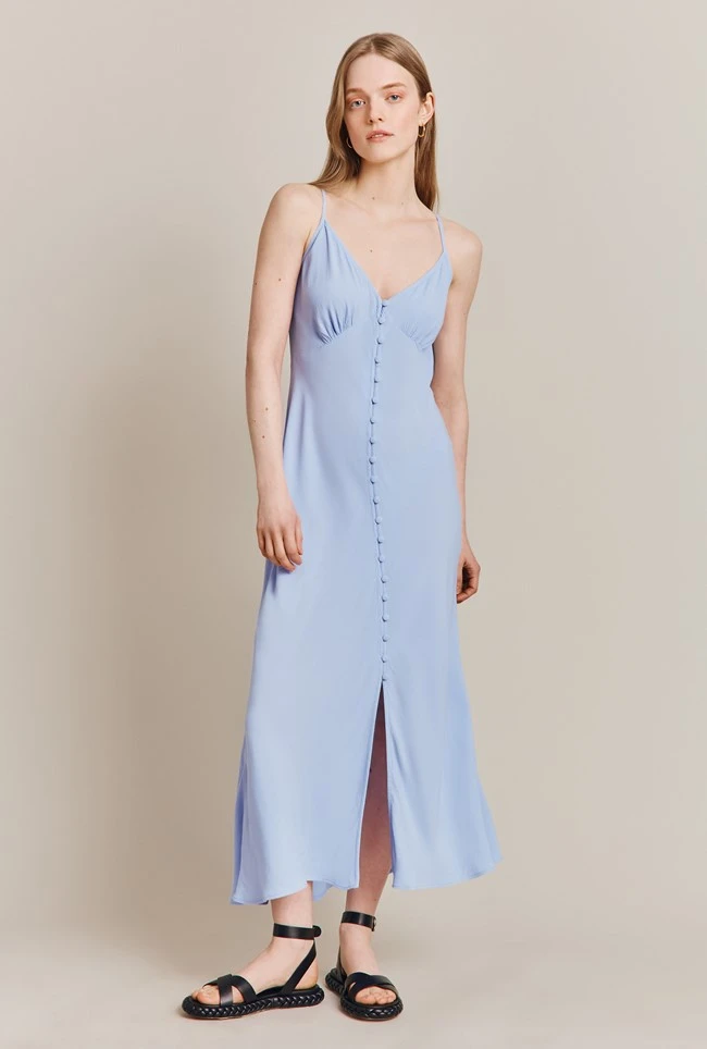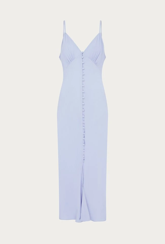 Make Sofia your go-to summer frock this season. A classic slip dress with adjustable straps, Sofia is crafted from luxuriously our soft and lightweight summer crepe with a button-through front that skims the silhouette beautifully. Dress up with heels and a statement clutch or down with sneakers and a denim jacket.